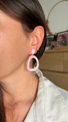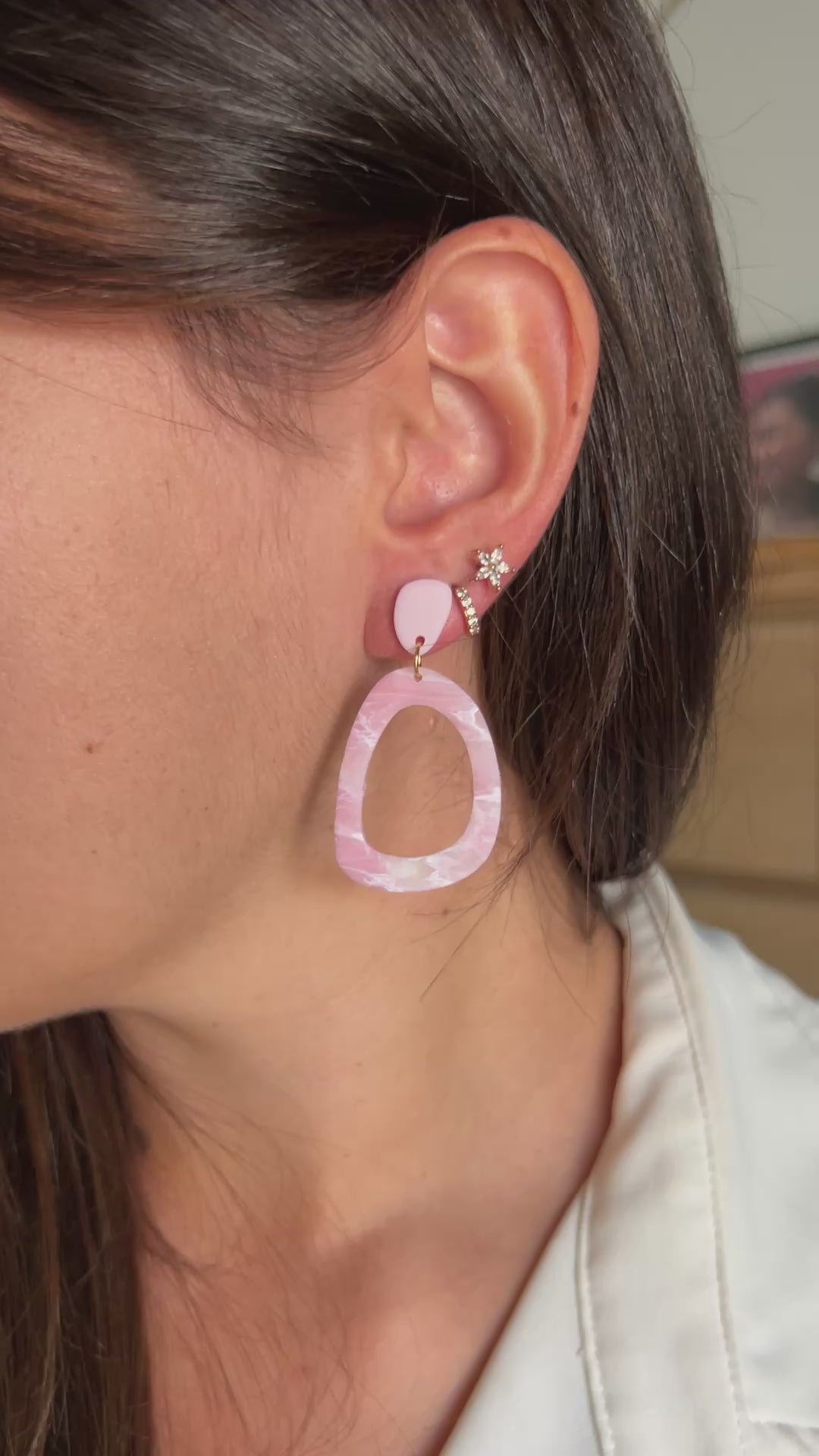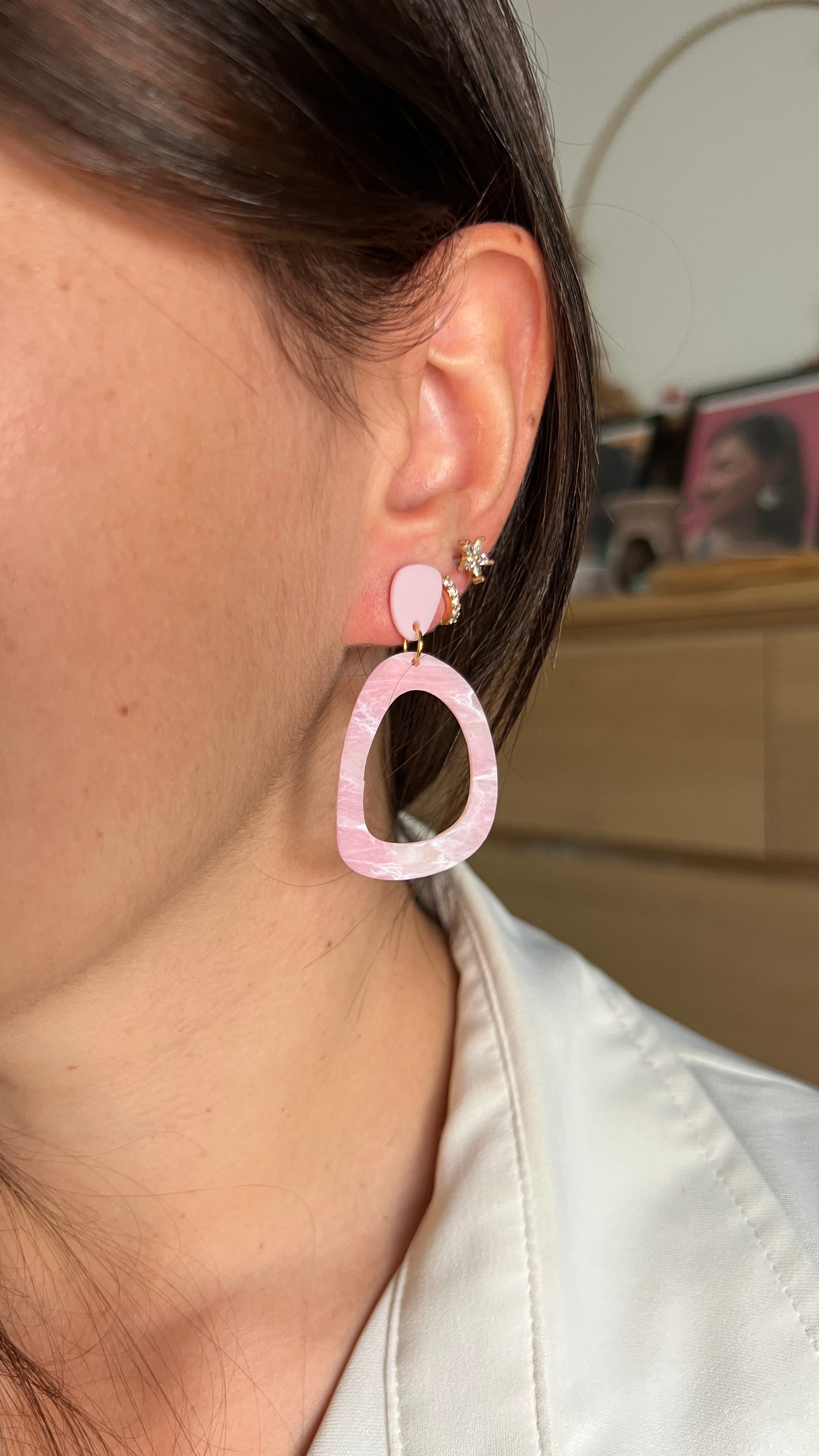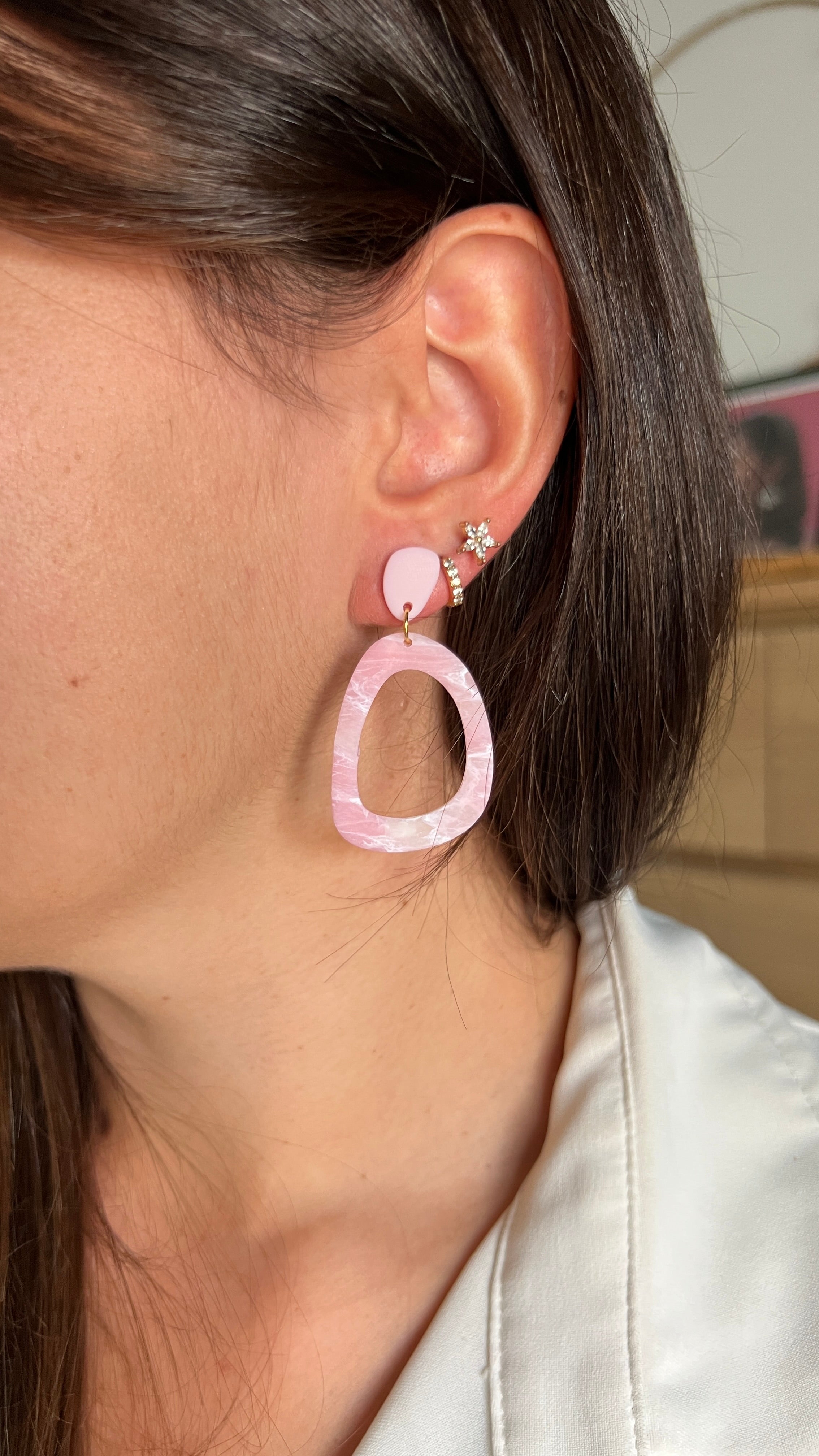Les boucles d’oreilles Emma mêlent une petite pastille rose brillante (résinée) sur le lobe et une grande pièce ajourée à l’effet marbré et mat, jouant avec la transparence comme une pierre de quartz rose.